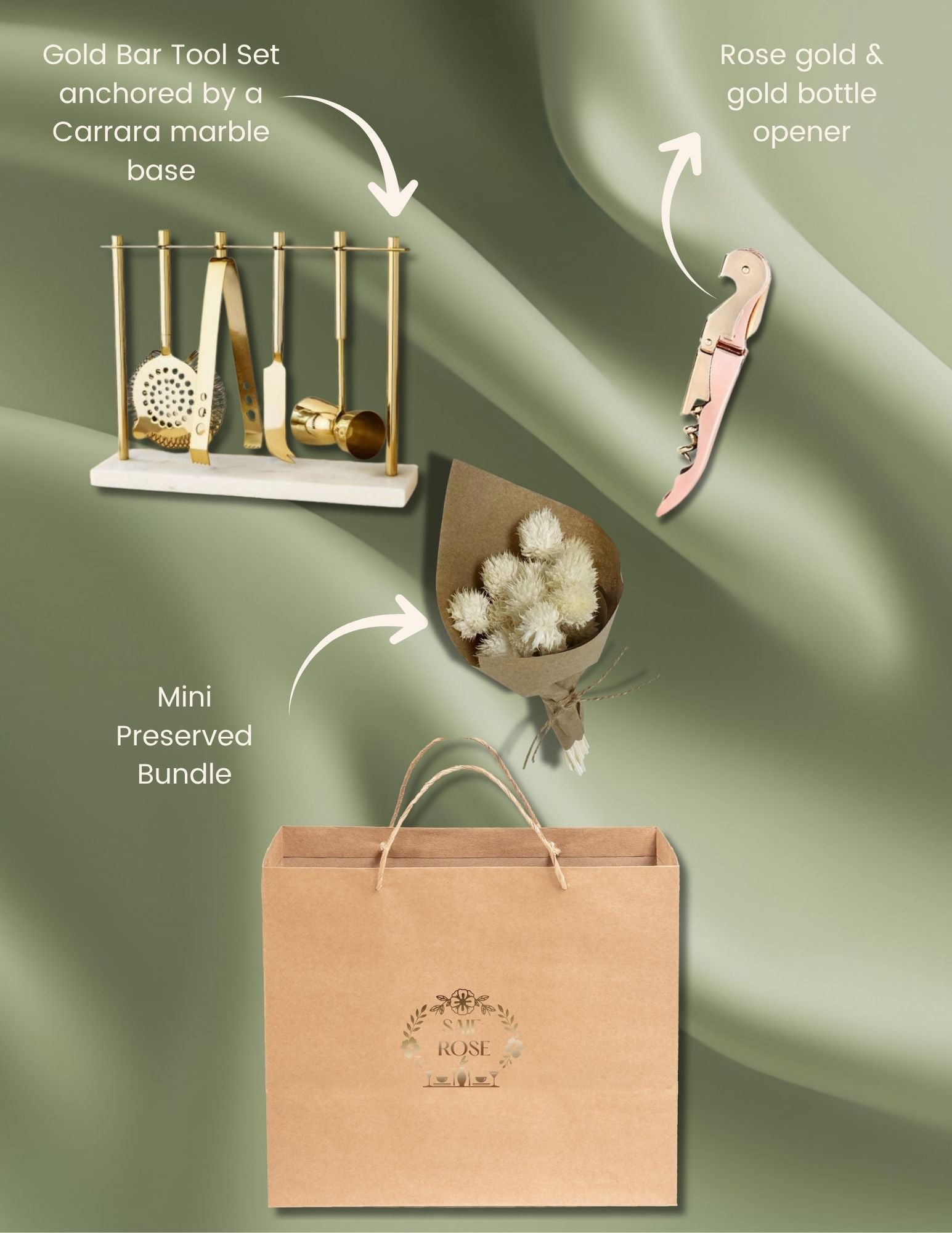 Bring beauty to your bar cart with The Mini Cocktail Edit — a compact yet striking curation of cocktail essentials designed for elevated home entertaining. With luxe metallic accents and a touch of everlasting florals, this set makes a stunning gift or a styled addition to your own space.